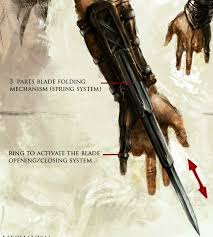 La hoja oculta es el arma más identificadora de un asesino,originariamente se debía amputar un dedo para no dañar los demás dedos o la mano se activaba con el dedo meñique y la hermandad solo dejaba el manejo de una en la mano izquierda.Claro que esto avanzó pues esto fue en la época de Altair cuando Ezio se convirtió en asesino Leonardo Da Vinci creo dos hojas ocultas para Ezio sin amputar el dedo esto fue una innovación para los asesinos por lo que pudieron usar dos hojas ocultas.Altair creo(gracias al conocimiento concedido por el fruto del Edén)la armadura perfecta,la hoja envenenada y el cañón oculto.En épocas de Altair el mecanismo de la hoja se activaba con el dedo pero en las épocas de Ezio había como una especie de bastón pequeño que al hacer un movimiento brusco hacia abajo la hoja salia pero al hacerlo hacia arriba la hoja se ocultaba.